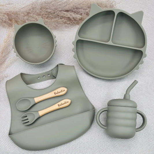 Coffret Repas Bébé Personnalisé – Assiette Chat, Bol, Tasse, Bavoir & Couverts