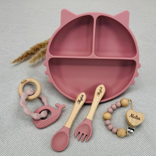 coffret repas bebe personnalise en Silicone – Assiette, Couverts, Jouet