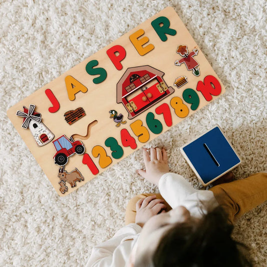 Puzzle Bébé Bois - Prénom Personnalisé & Thème Ferme Montessori